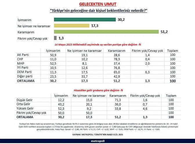 Son yapılan MetroPOLL Araştırma’sı, Türkiye’nin geleceği hakkında toplumun genel olarak umutsuz olduğunu gösterdi. Araştırmaya katılanların %51,2’si karamsar, %30,2’si ise iyimser olduğunu belirtti. Ayrıca, katılımcıların %17,3’ü ne iyimser ne de karamsar olduğunu, %1,3’ü ise fikrini net beyan edemedi.